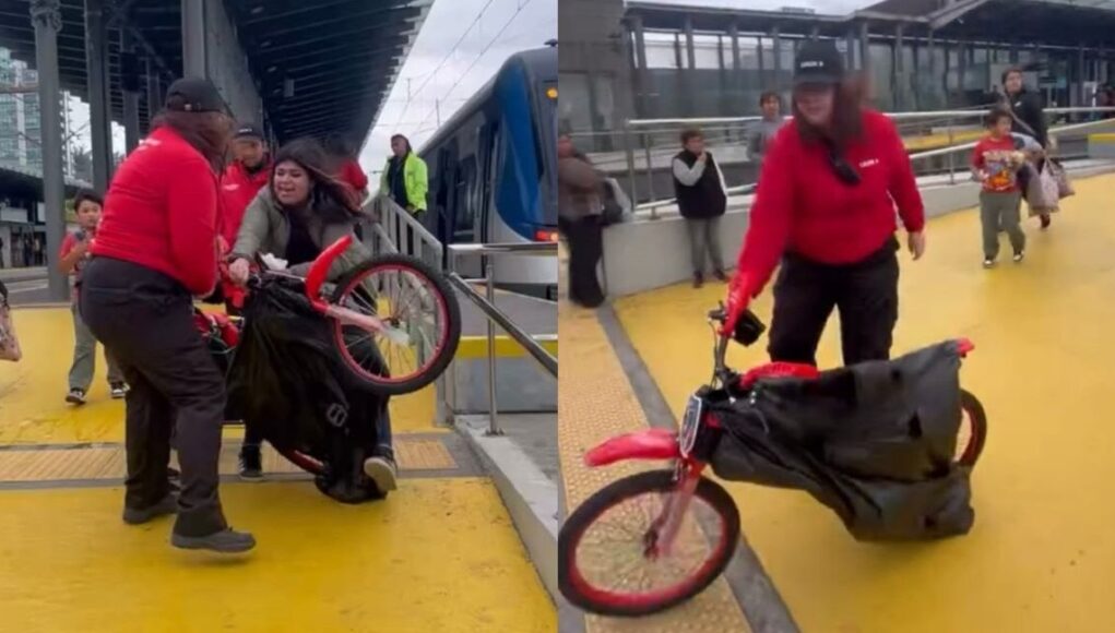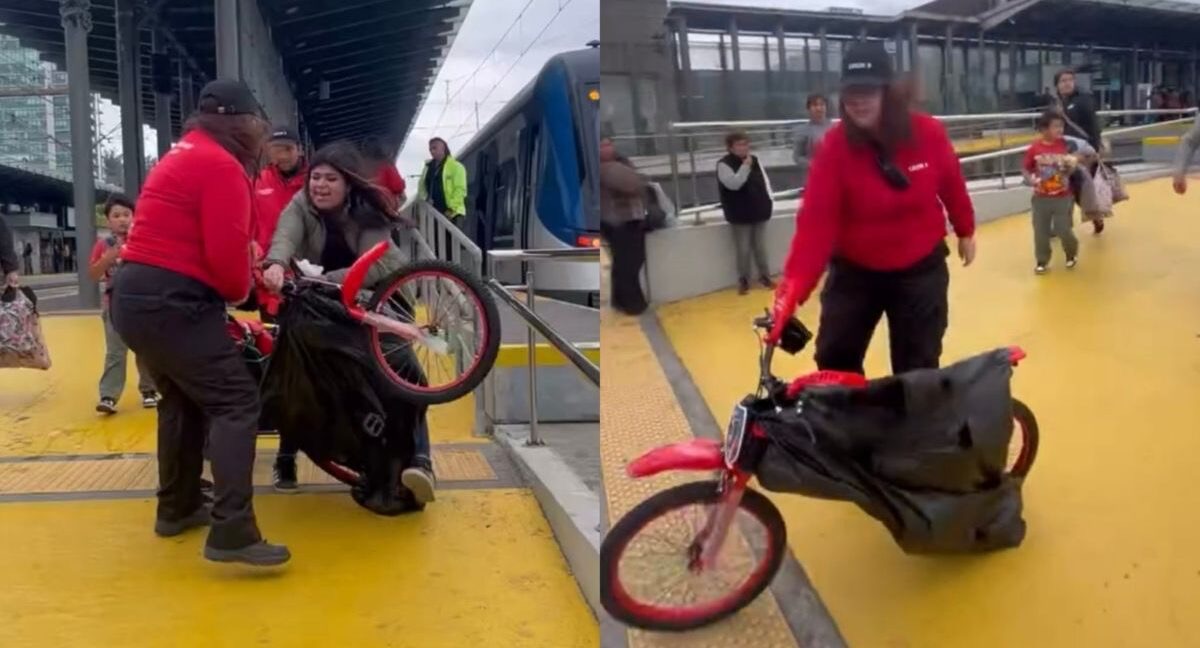 En el registro se aprecia a la guardia forcejeando con la pasajera y quitándole la bicicleta, para luego dirigirse hacia otro lugar mientras las mujeres seguían discutiendo.