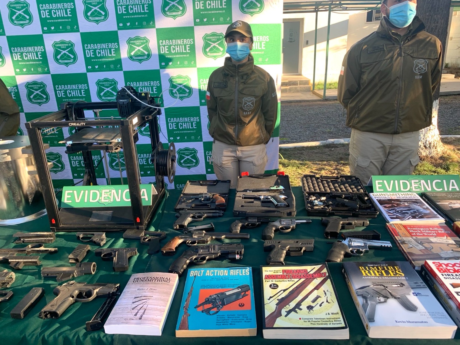 Además de las piezas de armas, se incautó una serie de literatura, es decir, libros con instrucciones y documentación sobre cómo fabricar armas de fuego, lo que sugiere que el detenido poseía conocimientos específicos para la elaboración de este tipo de productos. Tras el allanamiento a tres domicilios, Carabineros logró llenar una serie de armamentos.